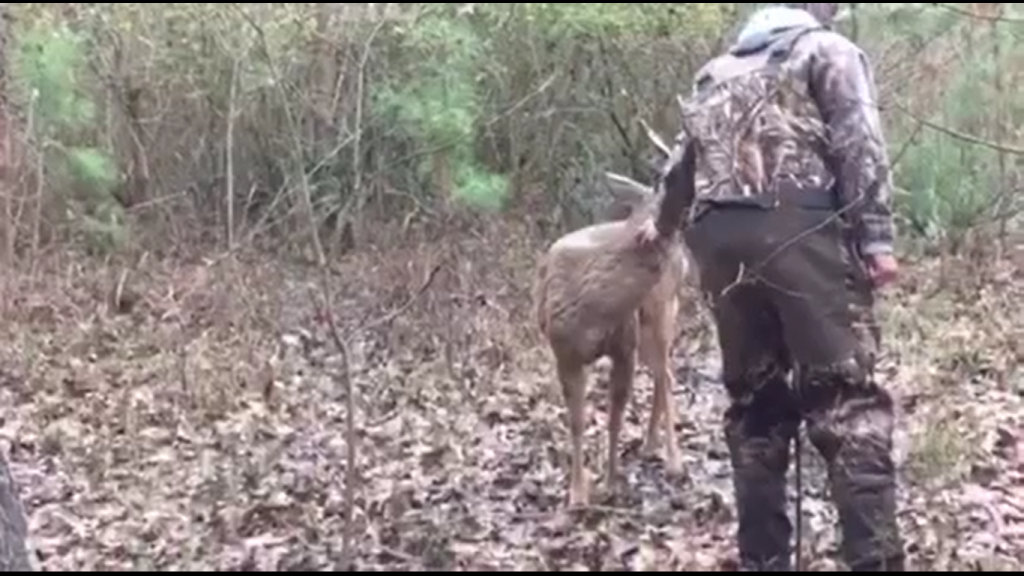 After a duck hunting trip, some hunters came upon this whitetail buck. The buck is clearly weak, and acts as if he doesn’t care what the men do.