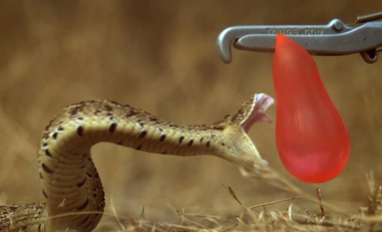 Watch as a puff adder, a very poisonous snake, tenses its neck area, readying its muscles for the strike, and then extends its hypodermic-like fangs to inject poison. Luckily, only a water balloon gets bitten, but the process is amazingly clear and detailed.