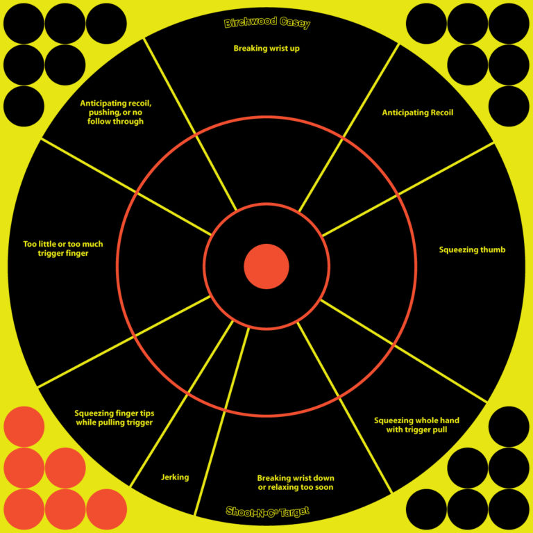 The new Shoot.N.C 12″ Handgun Trainer target from Birchwood Casey provides instant feedback and instruction with each shot. The Handgun Trainer target is printed with instructions on various quadrants of the target to help shooters see where they may be making a mistake in their form while shooting. Advice such as anticipating recoil, breaking the wrist up or down, jerking and squeezing the thumb are a few of the items addressed by the target. By following the directions given based on where the bullet strikes the target, shooters can learn to adjust their form and tighten their groups.