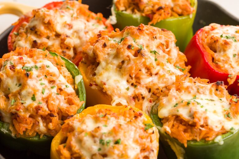 - Pour remaining tomato sauce over peppers. Cover with foil and continue to bake 20 minutes.