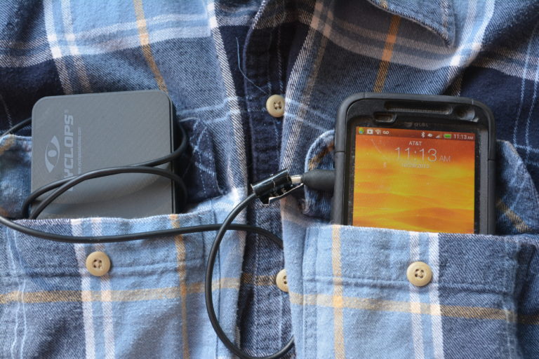• Use a battery charging device such as the Cyclops unit (shown below). It provides up to five charges, but the cold weather can reduce its efficiency. After forgetting to turn my phone off, I connected the two from my breast pockets and quickly received a charge.